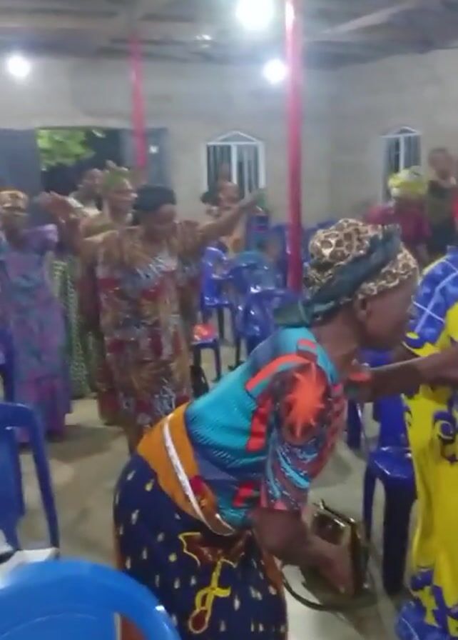 The video depicts a group of mostly older women dancing and singing inside what appears to be a church or meeting hall