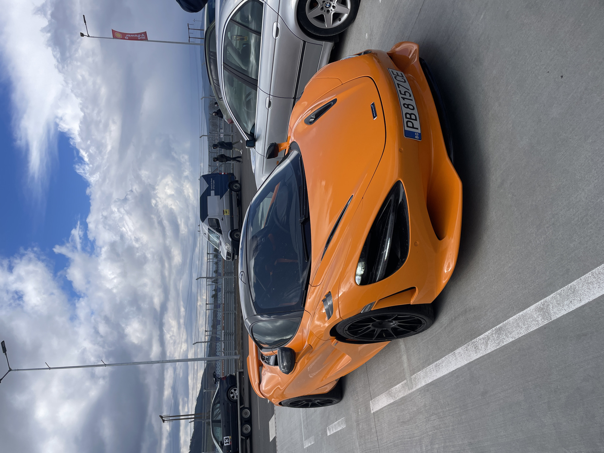 n orange McLaren sports car parked in Dospey, Bulgaria. The car's license plate reads "PB 8157 CE" and is from Bulgaria ("BG"). Other vehicles are parked nearby, including a silver BMW and a white van with the text "Unlock the Power of Your Crypto." A Shell "V-Power" flag is visible in the background, along with a fence, light poles, and a cloudy sky. Several people are walking in the background, near the fence. The ground is gray concrete with white parking lines. The vehicles are located close to the mountain slopes and the fence.