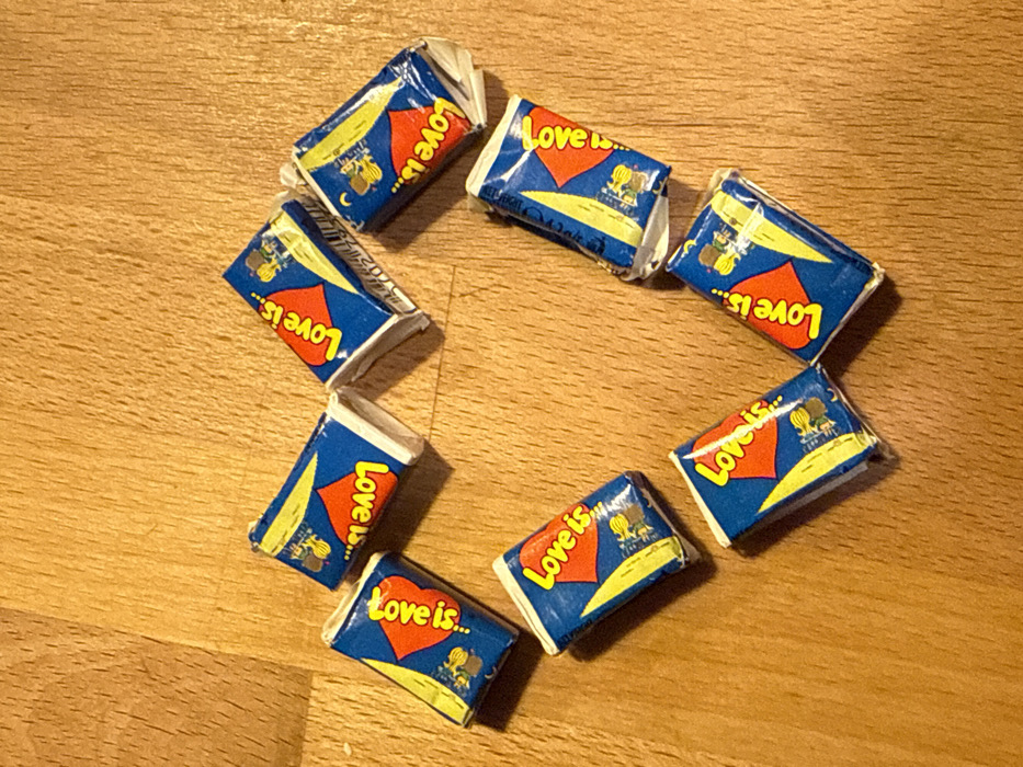 Eight pieces of "Love is..." bubble gum are arranged in a circle on a wood surface. The gum wrappers are blue with a yellow base featuring cartoon characters. A red heart encompasses the "Love is..." text. The wrappers are slightly crumpled, suggesting they might have been handled or carried around. The wood surface appears to be a table or countertop.
