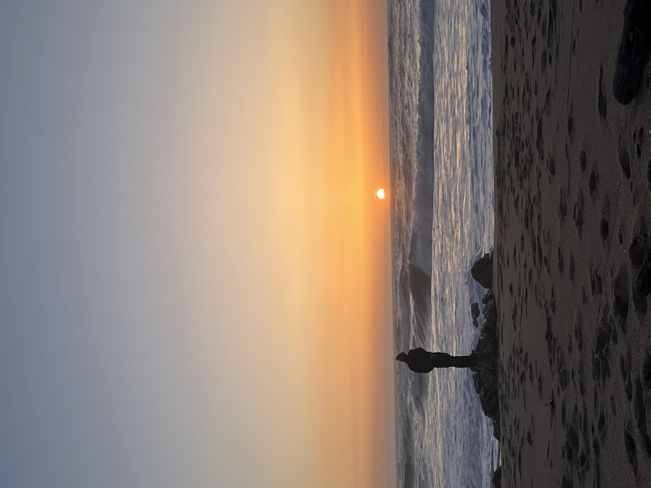 The image depicts a sunset over a coastal area in Matosinhos, Portugal. The sky transitions from a light blue at the top to warm orange and yellow tones at the horizon, where a distinct, bright orange sun is visible slightly left of center. The Atlantic Ocean features moderate waves with white foam, reflecting the sunset colors. A single individual, silhouetted in dark clothing and wearing a hood, stands atop a dark rock formation at the water's edge, facing the ocean and the setting sun. The sandy foreground of the beach shows numerous footprints. Additional dark rocks are present near the waterline. The scene is devoid of other individuals or significant man-made structures.