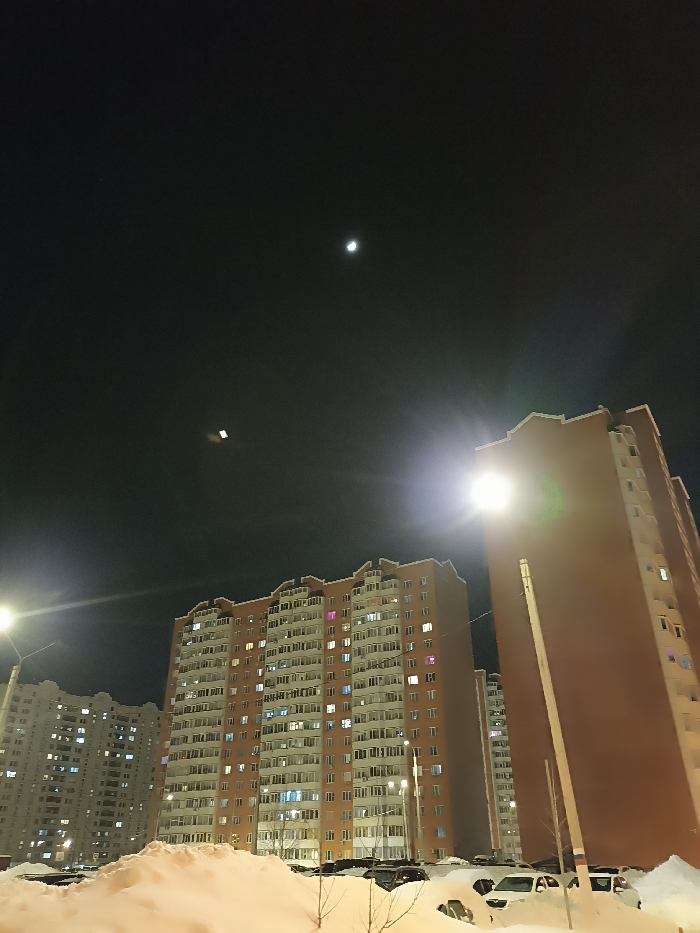 night scene with several high-rise apartment buildings. Many windows are illuminated in the buildings, indicating residential activity. A bright street light casts a glare on the scene. The ground is covered in a thick layer of snow, with several cars parked amid the snowdrifts. The night sky is dark, with a faint crescent moon visible in the upper part of the image. A possible satellite can be observed as well.