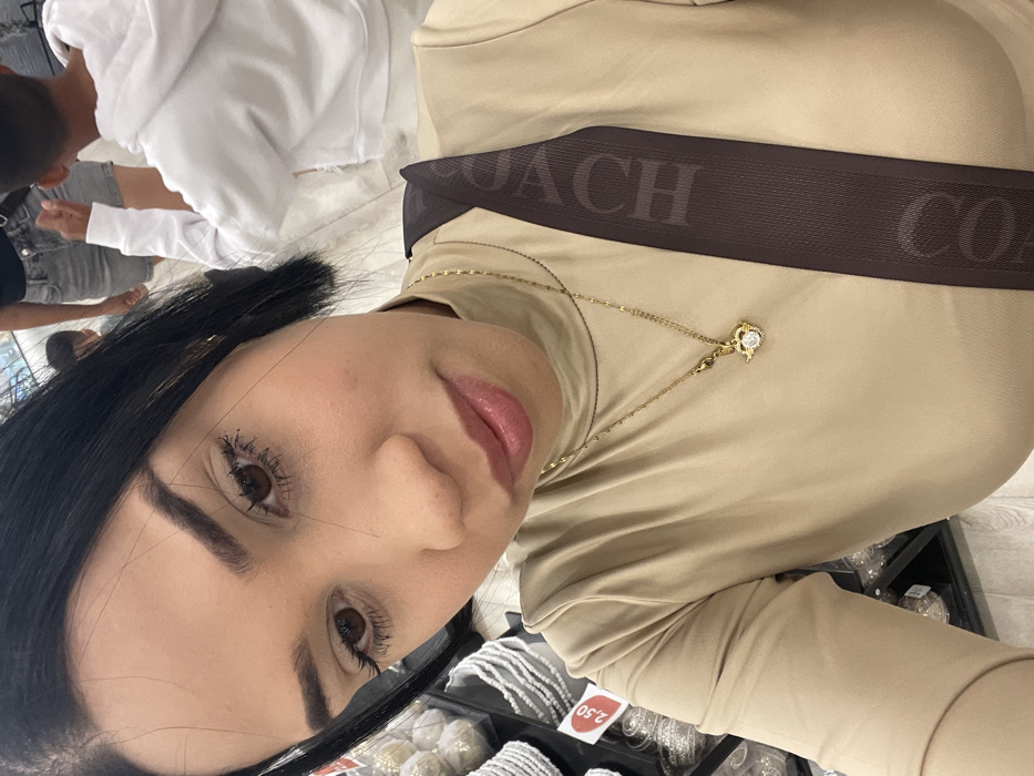 An adult female with dark hair and light-brown eyes is centered in a close-up, slightly high-angle photograph. She wears a long-sleeved, high-necked beige top and a gold-colored chain necklace with a circular pendant featuring a clear central stone. A dark brown strap, partially visible and branded "COACH," crosses her torso diagonally from her right shoulder. The background, out of focus, reveals an indoor retail setting. To the left, shelves display merchandise, including white and clear decorative items, with a red-and-white price tag showing "2.50." In the far background, blurred figures of two children and an adult are present. The scene is located in a retail store in Unknown, Unknown.