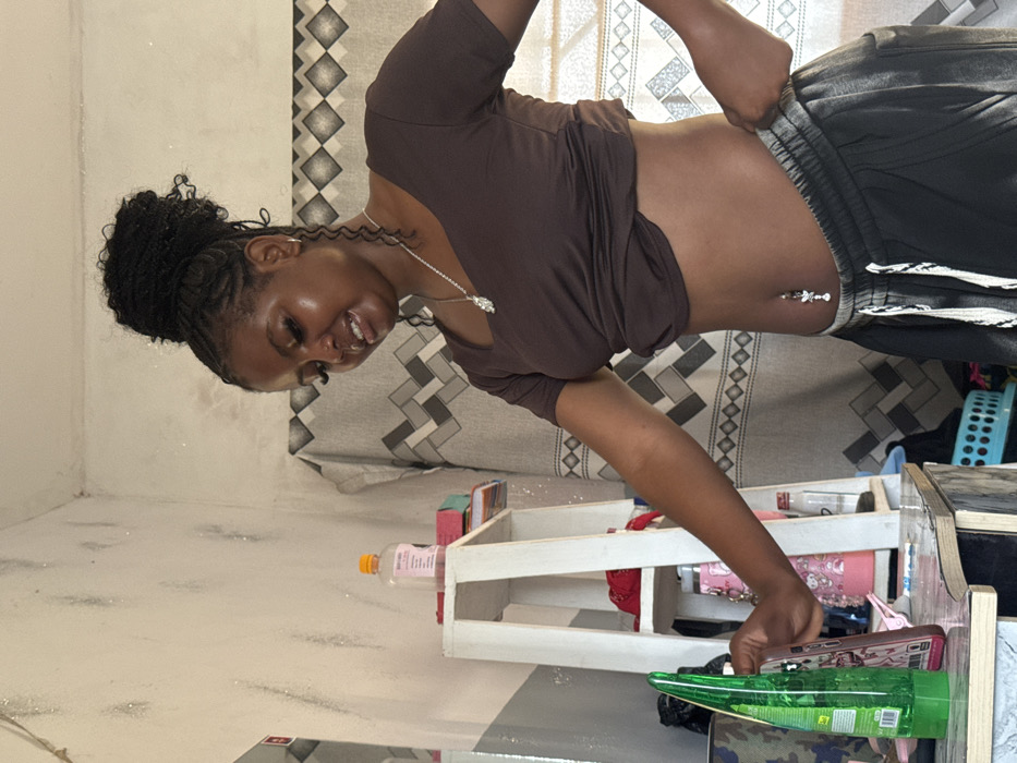 A young female stands in an interior room in Gbongan, Nigeria, oriented towards a dressing table or counter on the left. She has dark skin, black micro-braided hair pulled into a high bun, and two loose curly strands frame her face. Her visible left ear has a small hoop earring, and a silver-toned chain necklace with a pendant is worn around her neck. She is wearing a dark brown, short-sleeved, square-neck crop top that exposes her midriff, which features a silver-toned navel piercing with a butterfly or floral dangle. Dark grey or black sweatpants with a white drawstring cover her lower body. Her right hand rests on a tall, conical green bottle on the table, while her left hand is positioned near the waistband of her sweatpants. Her head is slightly tilted downwards, and her expression indicates a subtle smile. The room's walls are light-colored with scattered silver flecks and minor smudges. On the left, a partially visible mirror reflects a sliver of the room. A white, two-tiered wooden shelf unit stands on the dressing table, holding a clear plastic bottle with an orange cap and pink liquid, small books, a red fabric item, and other containers. A green conical bottle and a pink mobile phone case are positioned on the table surface. Behind the female, a fabric curtain or tapestry with a repetitive geometric pattern of interlocking grey and black zigzag shapes hangs on the wall. A light blue perforated plastic basket is visible in the lower right background.