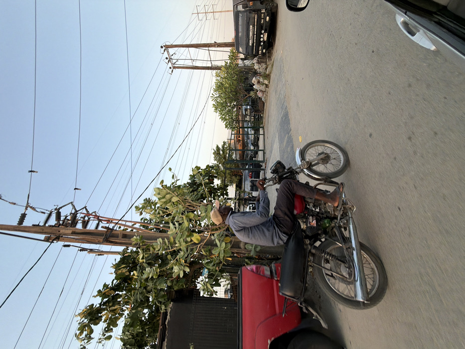 A man sits on a motorcycle with no seat. He's wearing a light-colored hat, blue shirt, and dark pants, and he's barefoot. The motorcycle appears to be broken. A red pickup truck with a large black box in the back is parked behind the motorcycle. Power lines stretch above, and there are trees, parked cars, and a building in the background. The street is asphalt.