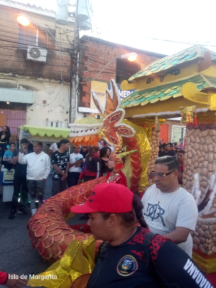A vibrant parade scene captures a large golden dragon structure with a red tail, likely part of a float. A person in ornate attire is visible on the dragon's back. People surround the dragon, including a man in a white t-shirt and sunglasses, and a person in a red cap and dark uniform. Buildings and a pole with lights and wires form the backdrop. The phrase "Isla de Margarita" is in the lower-left corner of the image.