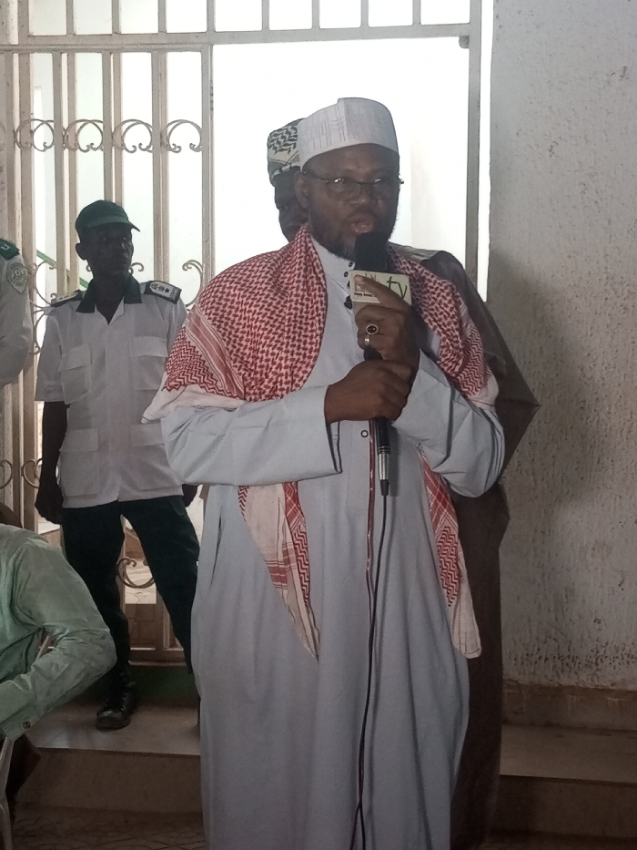 A man wearing a white robe, a red and white checkered scarf, a white skullcap, and eyeglasses is holding a microphone. He is standing and speaking. Behind him, partially obscured, are a man wearing a white shirt and green hat, another man wearing a white skullcap, and a man wearing a brown shirt. The man holding the microphone appears to be indoors, possibly in a mosque or an event space. The scene is likely in Birnin Kebbi, Nigeria, at the coordinates 12.45 latitude, 4.207 longitude.