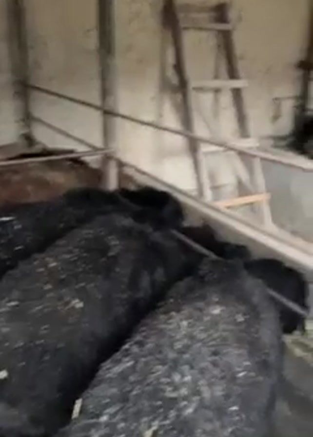 group of cows in what appears to be a barn. The cows in the foreground are black and covered with bits of hay. In the background, a second group of cows is visible; they are reddish-brown. The cows are eating from a concrete trough that runs along the wall of the barn. The barn is rustic, with walls of whitewashed brick or plaster and exposed wooden beams. A wooden ladder leans against the wall. The light in the barn is dim, with a single bulb hanging from the ceiling.