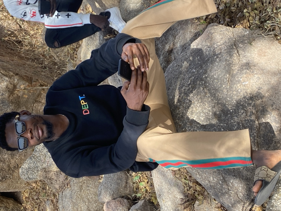 A daytime outdoor scene in the city of Nabatum, Nigeria, displays two males positioned among large grey boulders and sparse vegetation. In the foreground, an adult male with dark skin, short dark hair, and a trimmed beard is seated on a boulder. He is wearing dark square-framed sunglasses, a black long-sleeved sweatshirt with "DEPT." in multi-colored letters on the chest, tan athletic pants featuring a vertical red and green stripe on the outer seam of the left leg, and a tan patterned slide sandal on his left foot. His hands are clasped, holding a black smartphone. He maintains a neutral expression, looking directly at the viewer. Partially visible in the upper right background, a second individual is seated on rocks, wearing a white long-sleeved shirt with black graphics, black ripped jeans, and white athletic shoes. This individual holds a small black container. The immediate environment consists of numerous irregularly shaped grey boulders, dry leaves, and minimal ground vegetation. Strong sunlight creates distinct shadows.