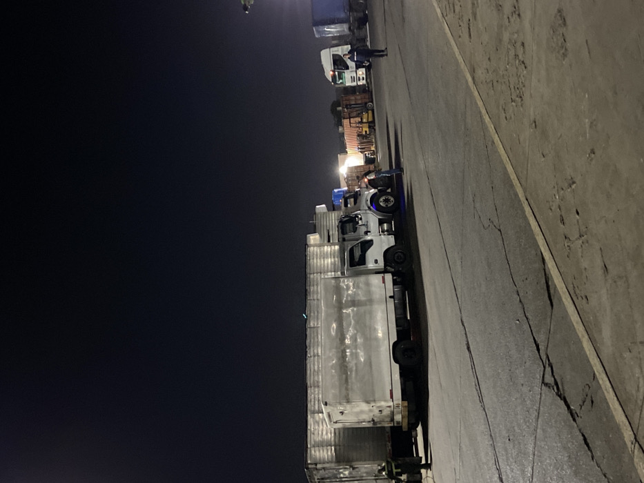 A row of semi-trucks are parked along a concrete expanse at night. The closest truck is long and white, with a box-like cargo area. Further down the line, there are other trucks and what appears to be some kind of machinery. A lone figure stands near one of the trucks. The sky is dark and clear, with a few streetlights providing illumination. Cracks mark the surface of the concrete.