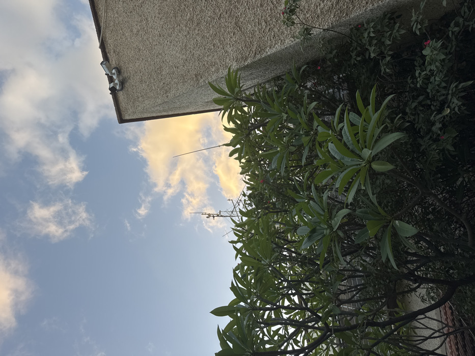 A low-angle exterior shot captures a dense arrangement of green foliage in the foreground, primarily large-leafed plants, with glimpses of darker branches and a few small red flowers. Behind the vegetation, a light beige, textured building wall with a brown roofline trim is visible on the right, featuring two white dome-shaped surveillance cameras mounted high on its corner. In the midground, against a partially cloudy sky with hues of blue, white, and yellow-orange, a metal lattice communication tower with multiple antennas is present, along with another slender, vertical antenna pole extending above the foliage. The scene is located within the Gilboa Regional Council, Israel, depicting an outdoor environment. No individuals or active interactions are observed.