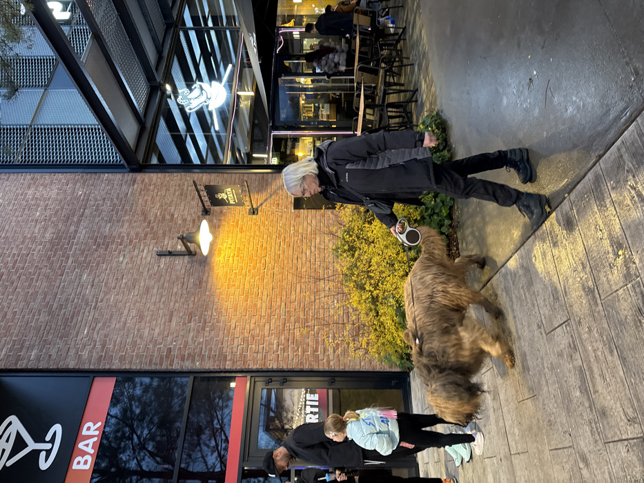 This image depicts an outdoor commercial promenade in Reichstett, France, during what appears to be late afternoon or evening. A woman with short, light-colored hair, wearing a black puffer jacket, dark trousers, and dark boots, walks from right to left, holding a grey and white retractable leash attached to a large, shaggy, brown-colored dog. The dog's head is lowered, indicating it is sniffing the ground. To the left, a man wearing a black baseball cap and dark shirt stands partially visible, next to a young girl with light hair in a light blue jacket and dark pants. They are positioned near a building with a black facade displaying a martini glass icon and the word "BAR" in red. This building has large glass panels reflecting trees. Adjoining this is a brick-faced building featuring a wall-mounted lamp casting a warm yellow glow on the brick and a hanging sign for "PITAYA" with a logo. Further to the right, beyond the woman and dog, is a modern structure with black metal beams and a mesh-like ceiling, beneath which an outdoor seating area with dark tables and chairs belongs to a restaurant with a bright neon logo visible through its glass facade. Inside the restaurant, multiple patrons are visible. The ground is paved with textured grey flagstones. Yellow flowering bushes are situated between the brick building and the paved walkway.