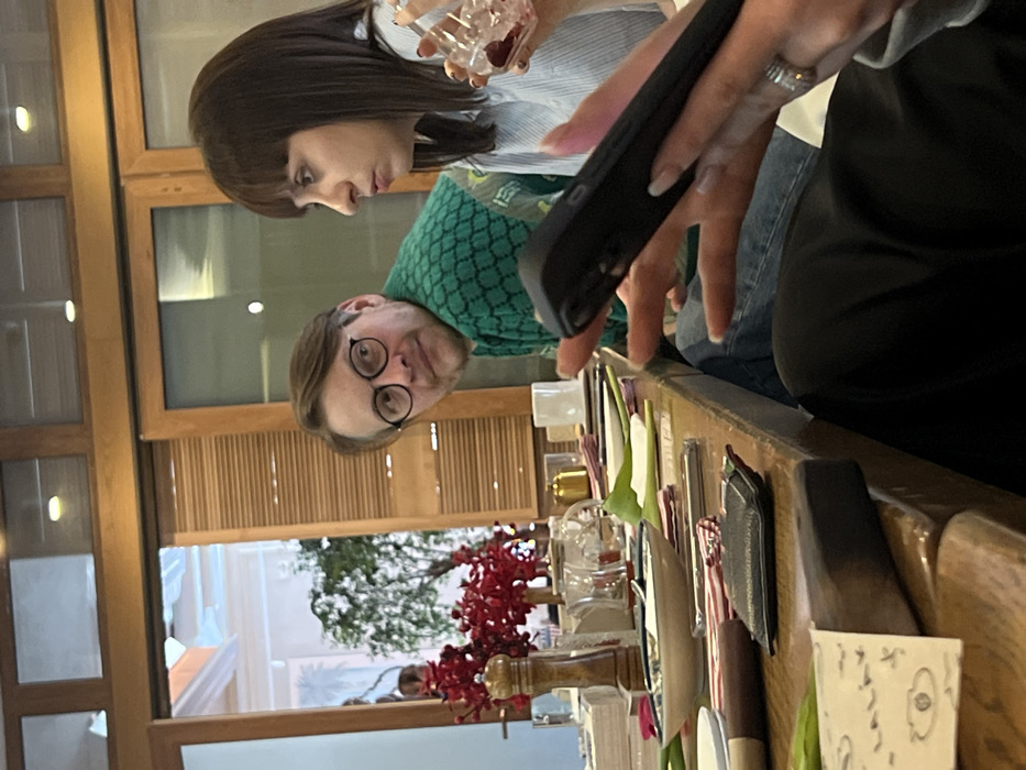 The scene depicts an indoor dining or social gathering environment, likely a restaurant or private residence. A long, dark wooden table occupies the midground, laden with various dinnerware and decor. Two individuals are the primary subjects. On the left, a male with light brown hair, wearing circular glasses and a distinct green, textured sweater, looks directly towards the camera with a slight smile. To his right, a female with dark, straight hair and bangs is seen in profile, looking towards her right. She holds a small, clear glass containing red berries in her right hand. In the immediate foreground, from the lower right, the hands of a person are visible, holding a black smartphone. This person wears a ring on the fourth finger of the left hand and is clad in blue jeans and a dark garment, visible beneath the table. On the table, objects include various white and light-colored plates, some with residual food, cutlery, and glasses. A tall wooden salt or pepper mill stands near a vase of vibrant red artificial flowers or berries. Also present are a small black leather wallet, a striped fabric item, green tulip stems, a gold-colored container, and white ceramic cups. A small white paper with the word "LALAV" and a drawing of an eye is partially visible in the far left foreground. The background features large wooden-framed sliding doors or partitions, one section appearing louvered. Beyond these, a brightly lit interior space with white walls and a large potted green plant or tree is visible. Recessed lighting fixtures are present in the ceiling. The specific location within the city of Pushkin, Russia, cannot be determined from the visual information provided in the image.