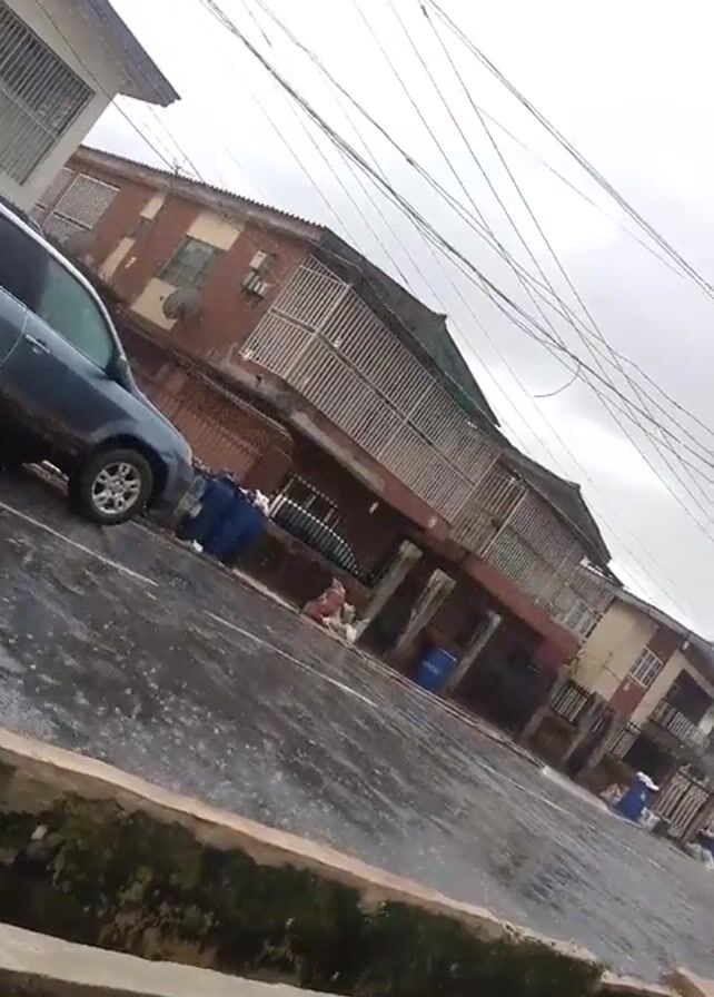 residential street scene in what appears to be a developing country. The street is wet, suggesting it has recently rained. A dark blue SUV is parked on the left side of the frame. Buildings are on the right side of the street, appearing to be multi-story apartments or houses with barred windows and balconies. There are trash bins and discarded items scattered along the street. Power lines are visible overhead, creating a dense web against the cloudy sky. In the center of the frame, an individual wearing a dark jacket or hooded sweatshirt walks by. There is also a concrete drainage ditch in the foreground. The camera angle is slightly tilted.