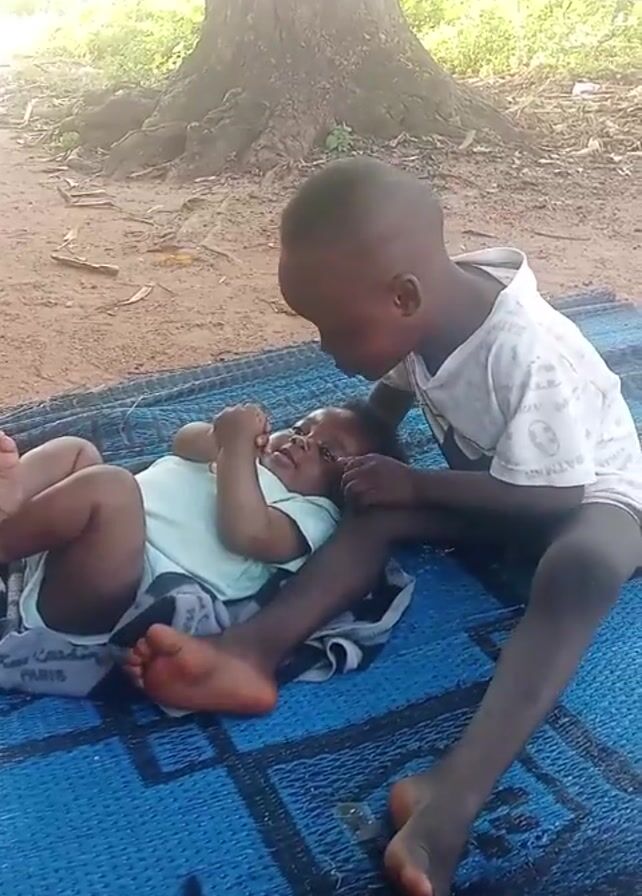 two young children outside on a blue mat. One child, wearing a light blue outfit, is lying on their back, while the other, dressed in a white shirt, is sitting beside them. The sitting child is looking at the lying child and touching their face gently. A large tree trunk is visible in the background. The ground is covered with dirt and some greenery.