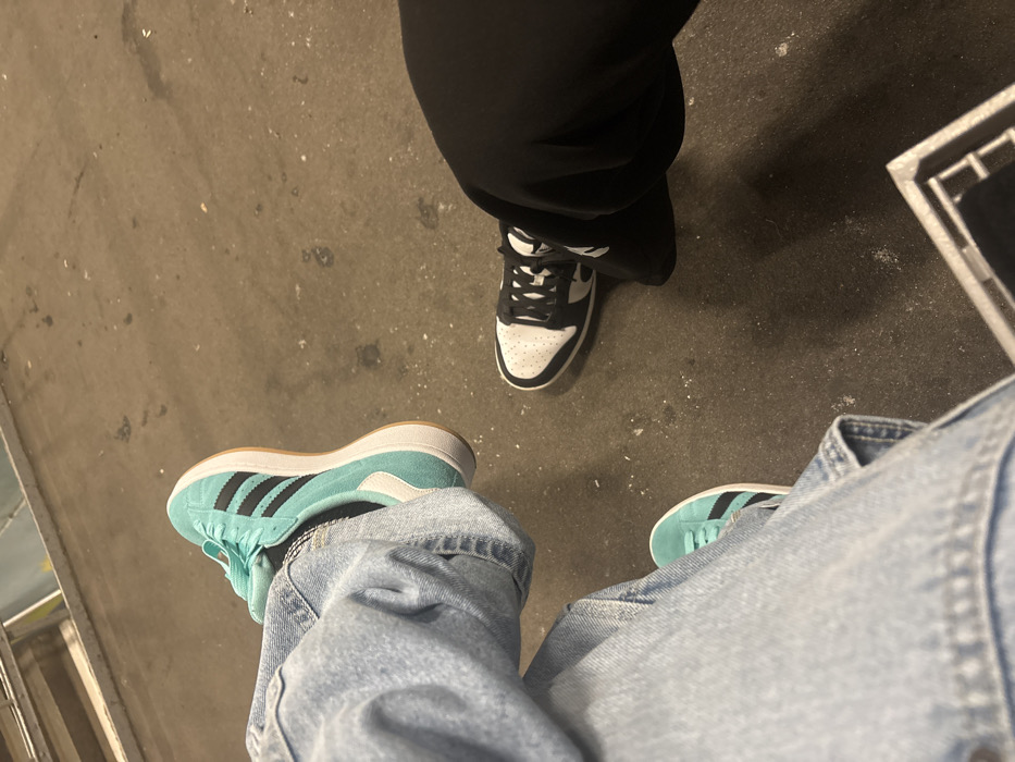 Two pairs of shoes are shown from a high-angle perspective. One pair features black and white Nike sneakers coupled with black pants. The second pair showcases turquoise Adidas sneakers with black stripes and white soles, worn with light-wash denim jeans. The background appears to be a concrete floor, possibly indoors. The lighting suggests an indoor setting.