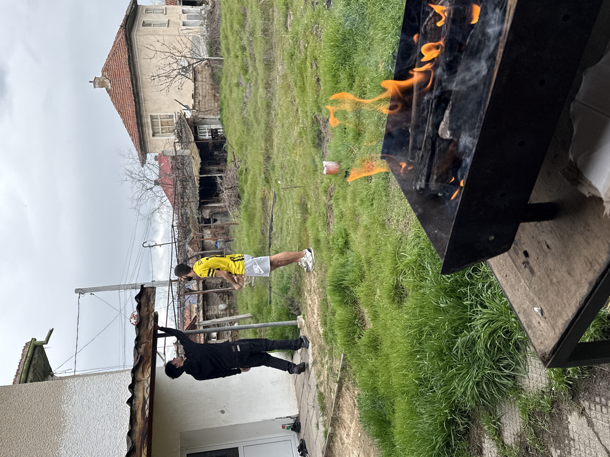 The image depicts a scene in Staro Zhelezare, Bulgaria. In the foreground, a barbecue grill with flames is partially visible. Behind the grill, two men are present. One man, wearing a black outfit, is reaching upwards toward a makeshift structure or low roof attached to a white building. The other man, wearing a yellow and black jersey and gray shorts, is standing on the grass near an open field. The field has a somewhat dilapidated house in the background. The sky is overcast.