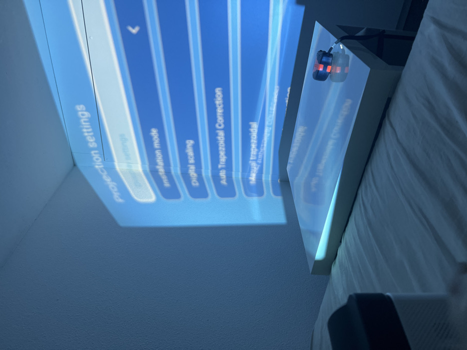 The scene depicts an interior room illuminated by a projector displaying a blue-toned menu titled "Projection settings" onto a light-colored wall