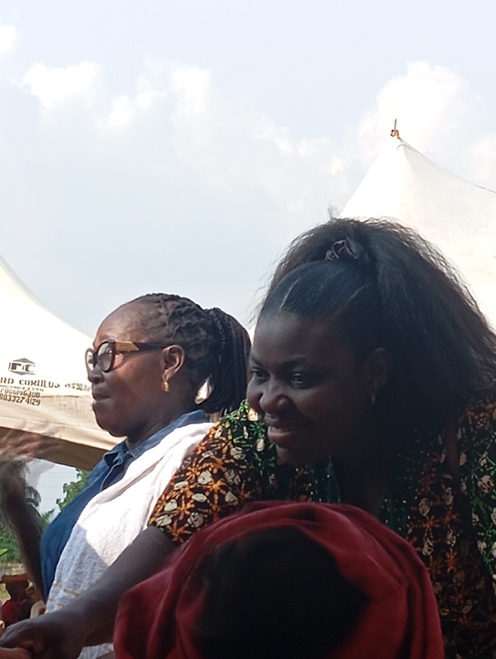 Two dark-skinned women are near a white tent under a cloudy sky. The woman on the left wears glasses and a blue shirt with a white shawl. Her hair is braided and pulled back. The woman on the right has dark hair and wears a colorful patterned top. Both women appear to be looking towards something in the lower left of the frame, obscured by a red cloth. The edge of the tent is visible in the background behind the woman on the left.