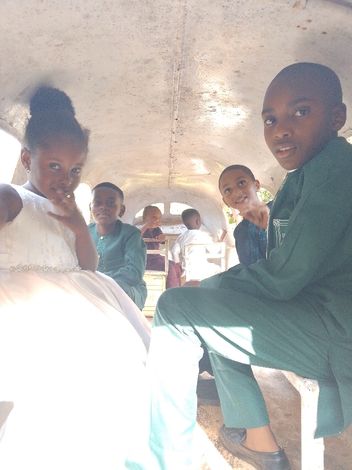 The scene is set inside a light-colored, curvilinear interior structure in Bukuru, Nigeria. Five children are visible. In the left foreground, a young girl, with dark hair in a bun, wears a white formal dress with a beaded waistline and faces the camera with her left hand raised near her chin. To her right, a boy, wearing a dark green long-sleeved garment, matching trousers, and dark loafers, is seated and looks towards the camera. Behind the girl, a second boy, similarly dressed in dark green, also looks forward. In the background, two younger children are partially visible; one in a dark reddish-brown top faces away to the left, and another in a white top is seen from behind to the right. All individuals are seated on white, bench-like structures. The interior walls and ceiling are light-colored and show signs of wear and discoloration, with small, arched openings along the sides. The area is brightly illuminated by natural light.