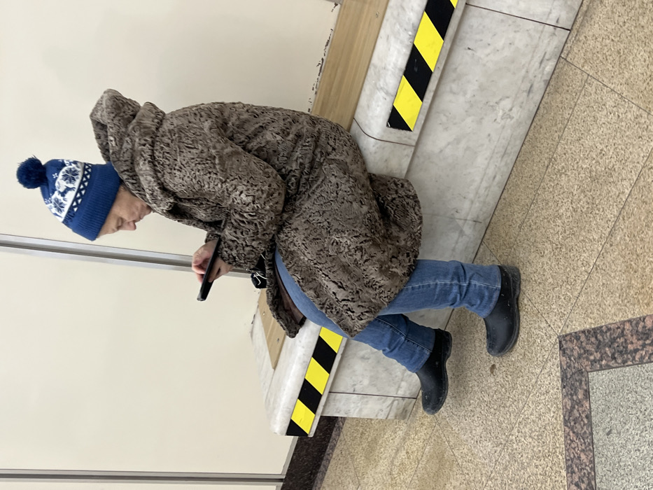 An elderly woman with a blue hat is intently looking at her phone. She wears a brown, patterned coat, jeans, and black boots. The woman appears to be leaning against a set of stairs with black and yellow caution stripes on the edges. The floor is a light brown, speckled tile, and a section of the floor has darker brown and gray tiles.