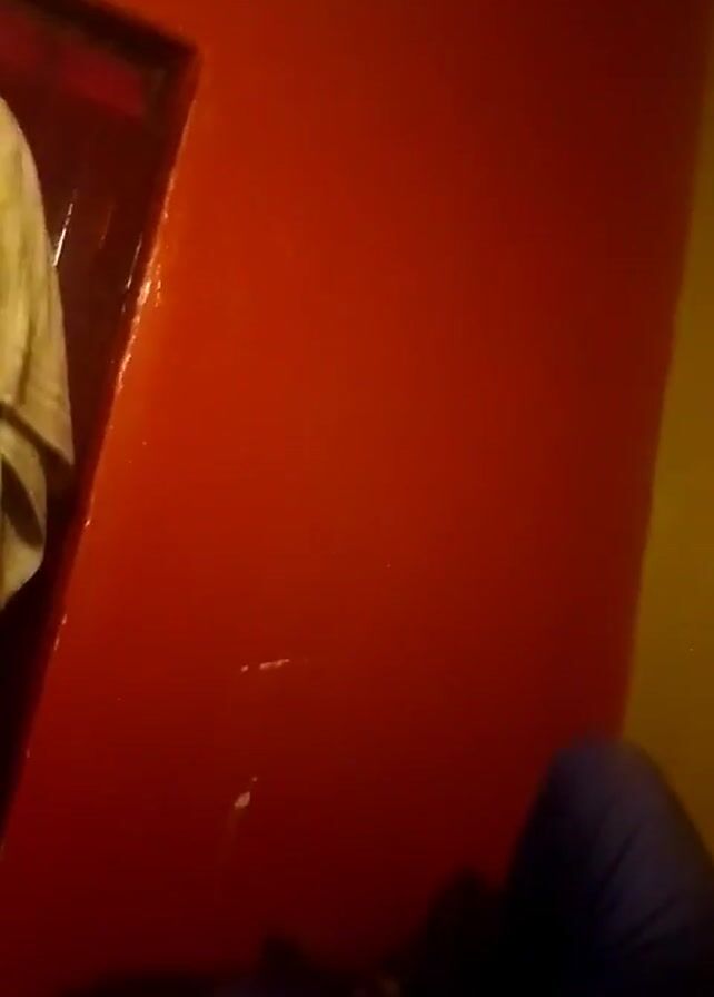 The video depicts an interior corner of a room with a bright orange wall, a yellow wall, and a white ceiling with a visible light source. On the left, a brown door frame is visible with a white towel hanging over it. The bottom of a blue object is partially visible in the bottom of the frame. The video is shaky.