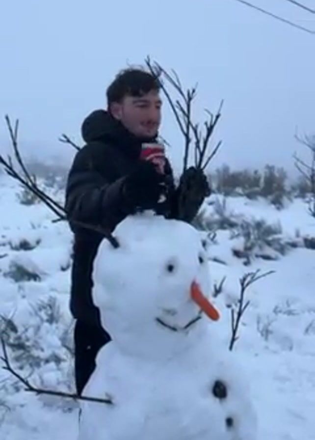 man standing in front of a snowman in a snowy environment. The snowman has a carrot nose, twig arms, and a can of Super Bock beer on its head. The man smiles, adjusts the can, and then walks away from the snowman. The background includes snowy terrain and scattered bushes. Above, power lines are visible. The weather is overcast.