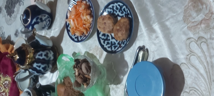 The image displays a close-up, slightly elevated view of a table setting in an indoor location. The specific city and country are unknown. No individuals are present in the frame. The table is covered with a light-colored tablecloth featuring a subtle patterned design. Prominently featured are two ceramic teapots with dark blue and white traditional patterns. The larger teapot, positioned centrally towards the top, has a gold-colored lid and base. A smaller, similarly patterned teapot is visible to its right. Various food items and dishes are arranged on the table. In the foreground-middle, two small, round, dark blue and white patterned plates are present. One plate holds two irregular, light brown baked items, possibly pastries. The other plate contains a portion of shredded orange-colored vegetables, with a silver fork partially inserted. To the left of these plates, a clear glass compote dish holds an assortment of nuts and dried fruits. A crumpled light green plastic material is visible near this dish. In the bottom-left, a round, solid light blue plastic lid or container partially covers other metallic utensils. A small dark pitcher with a white handle is partially visible to the left of the larger teapot. The background includes a glimpse of a red fabric with gold embellishment and a blurred, light-colored surface.
