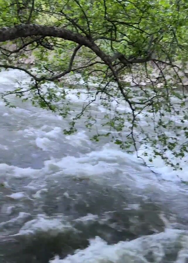 swiftly flowing river, its surface churning with white foam. Overhanging the water is a tree with bright green leaves and spindly branches. To the right of the frame, a concrete platform is visible, equipped with a metal railing. A thick, gray tree trunk stretches horizontally across the platform, partially obscuring the view of the river beyond.