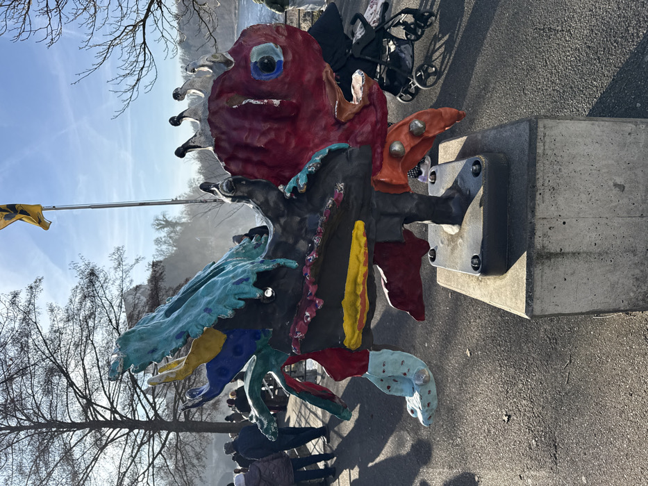 An outdoor scene in Neuhausen am Rheinfall, Switzerland, features a large, multicolored abstract sculpture on a sunny day. The sculpture, approximately 1.5 to 2 meters tall, depicts a stylized fish or dragon. Its head is predominantly red with a single blue eye and a silver-colored crown-like top. The body is dark gray/black with various appendages, including turquoise elements exhibiting a dripping effect, yellow accents, and orange and light blue sections with small circular patterns. The sculpture is anchored to a metallic base bolted onto a concrete pedestal. In the mid-ground to the left, a group of approximately 8-10 individuals, dressed in winter attire, are visible on a wooden walkway adjacent to the paved path. Bare deciduous trees line the left side, and a castle-like structure is faintly visible on a wooded embankment further back. To the right, a wide body of water, consistent with the Rhine River near the falls, is present, showing signs of mist or spray. A black baby stroller with an occupant is situated on the paved path behind the sculpture to the right. A tall flagpole with a yellow flag, bearing a black heraldic emblem, extends into a clear blue sky in the upper right quadrant. Strong sunlight casts distinct shadows across the paved ground.