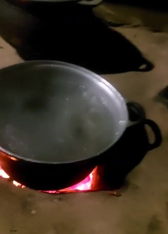 In a dim, seemingly outdoor setting, two pots are visible. One, a large silver-colored pot, is placed directly over an open fire built into a rudimentary clay hearth. Water is bubbling within this pot. Another, darker pot sits nearby, not directly on the fire. An apparent "awoo" sound is heard in the video. The environment appears rugged and simple.