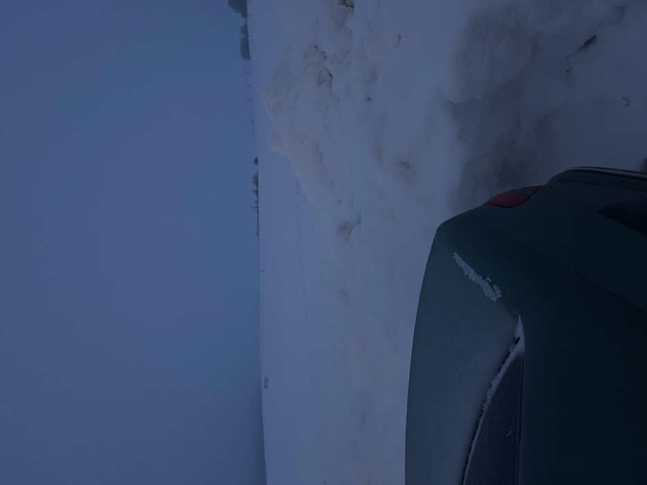 A car, partially visible, sits adjacent to snow-covered terrain. The background suggests a vast snowy field blending into a light blue sky or mist-covered expanse. The snow appears uneven, perhaps due to drifts or recent plowing. The car, possibly dark green, has snow accumulating on its rear section. The overall mood is cold and wintry, conveying a sense of solitude.