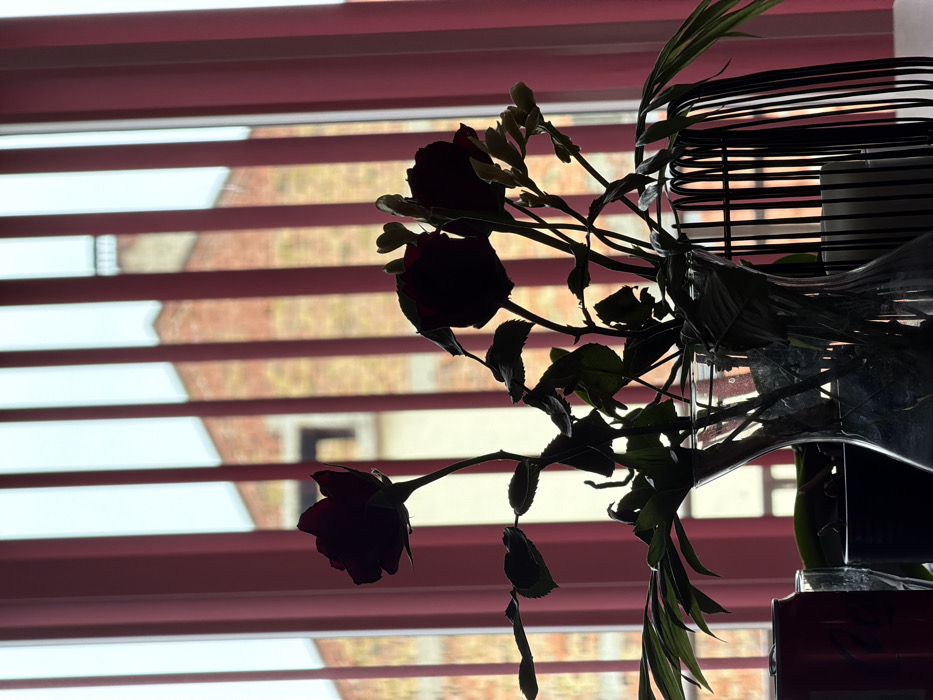 An indoor scene in Sliven, Bulgaria, is depicted looking outward through partially open vertical blinds during daylight hours. In the foreground, silhouetted objects are arranged on an unidentifiable surface. A clear glass vase holds a bouquet comprising at least three dark-petaled roses, additional smaller, lighter-colored flower buds, and various green foliage including broad palm-like leaves extending to the right. To the immediate left, a portion of a red Coca-Cola can is visible. To the right of the vase, a dark, open-cage metal decorative item, possibly a candle holder, contains a white cylindrical object. The midground consists of vertical window blinds, dark pink or burgundy in hue, spaced to reveal the exterior. The background features a multi-story building constructed of prominent red brick, distinguished by a tiled roof, an attic window structure, and a chimney. The sky beyond the building appears bright. No individuals are present.