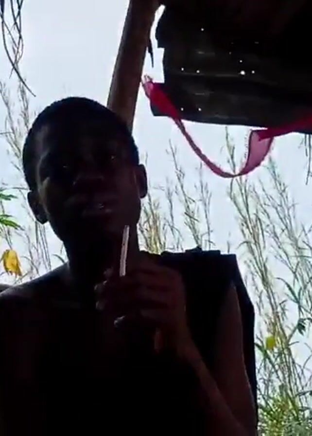 A young Black man, shirtless, sits under a corrugated tin roof supported by wooden beams. He is holding and working on a small, white, rolled cigarette in his hands, preparing it, as if to smoke. Red and yellow ribbons hang decoratively from the roof's structure. Tall grass and some small plants are visible in the background. There is the sound of music.