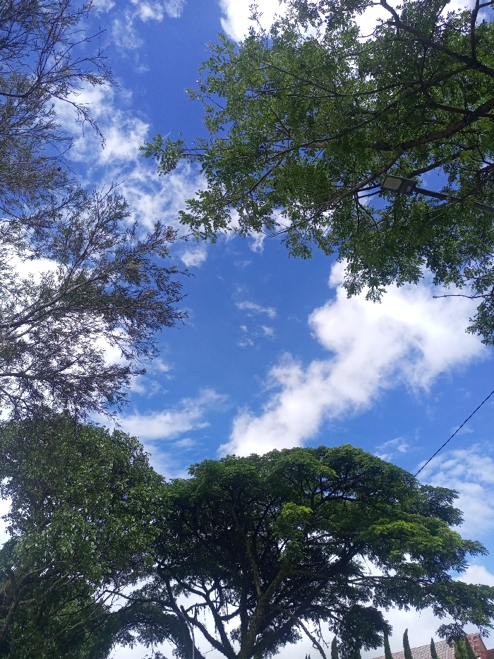 A vibrant sky with scattered white clouds peeks through a canopy of trees. Lush green foliage frames the view from the bottom and right, contrasting with the sparser, darker branches on the left. A large, shady tree dominates the lower part of the image. Beneath it, the rooftops of buildings are visible, with a light pole amidst the trees on the upper right. A power line stretches across the sky.