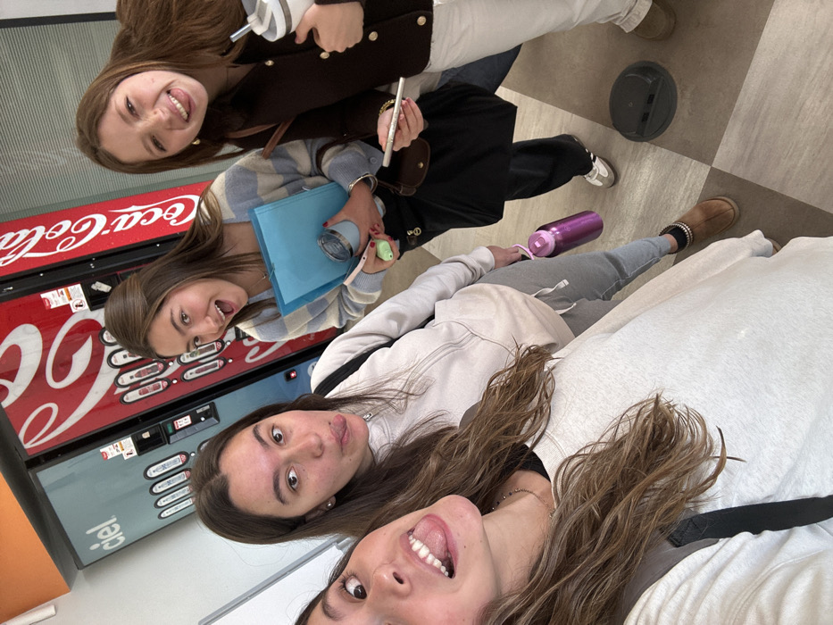 An indoor group selfie features four young adult females in what appears to be a modern public or semi-public space in Interlomas, Mexico. The exact location within Interlomas is undetermined, but the environment includes white walls, an orange accent panel on the upper left, and a tiled floor with alternating light and dark square patterns. In the background, two vending machines are visible: a teal machine branded "ciel" on the left and a red "Coca-Cola" machine on the right. From left to right: 1. A female, partially visible on the far left, has brown hair and wears a white long-sleeved top with a black backpack strap. She is making a playful face with her tongue extended. 2. A female with long brown hair wears a light beige full-zip hooded sweatshirt, grey sweatpants, and tan ankle boots. She holds a purple water bottle and also has her tongue extended. 3. A female with long brown hair wears a light blue and white striped long-sleeved sweater, dark pants, and white and grey sneakers. She holds a bright blue folder and a light blue insulated tumbler, with a small lime green item also in her hand. Her mouth is open in a wide smile. 4. A female, partially visible on the far right, has long brown hair and wears a dark brown collared top and white pants with tan shoes. She holds a white insulated tumbler and a white pen, displaying a wide smile. All four subjects are actively posing for the camera with expressive, playful facial gestures. A black, circular object, possibly a floor cleaning robot or a service access panel, rests on the tiled floor to the right.