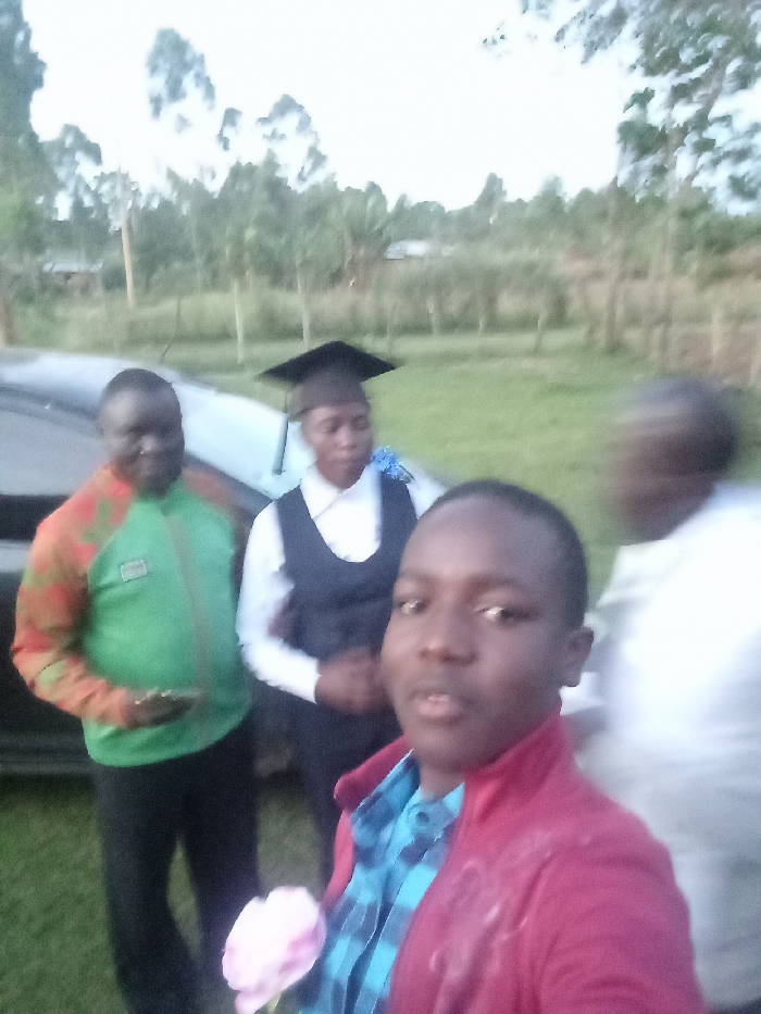 Four people are gathered outdoors. One person is wearing a graduation cap, a white shirt, and a dark vest. To the left of this person, someone is wearing a green and orange jacket and black pants. In the foreground, another person is holding a pink flower and wearing a red jacket over a blue plaid shirt. Another person is blurry in the background. They are standing near a car, with trees and grass in the background.