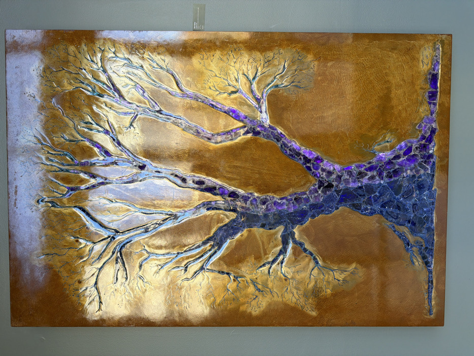 A rectangular artwork features a tree with bare branches. The trunk, situated right, is textured with purple and blue mosaic-like fragments. The branches extend across a metallic golden-brown background. The left side of the artwork displays a lighter, subtly patterned corner that complements the tree's silver-blue limbs. Overall, the piece presents a contrast between organic shapes and a shimmering, textured surface.