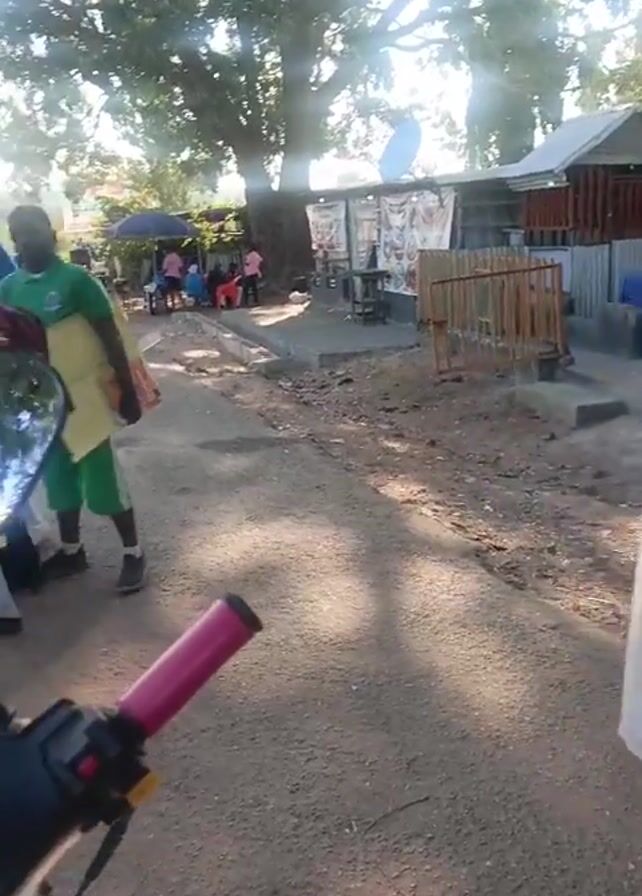 The video, shot from the perspective of someone on a moving scooter, shows a street scene in what appears to be a tropical or subtropical area. The road is unpaved and dusty. On the right side of the road is a small, simple structure with a corrugated metal roof and a partially enclosed wooden fence. There are various posters and images on the front of the building. Across from this structure are people sitting at tables under an awning or large tree, suggesting a small outdoor eatery or gathering spot. A person wearing a white head covering and a long white garment walks on the right side of the road. On the left side of the road, a group of young people, possibly students, are walking, carrying what appear to be books or materials. One person is wearing a green shirt and green shorts, and another is wearing a yellow top and black shorts. The handles of the scooter are visible in the foreground, with one handle having a pink grip. The sunlight is bright, causing a glare.