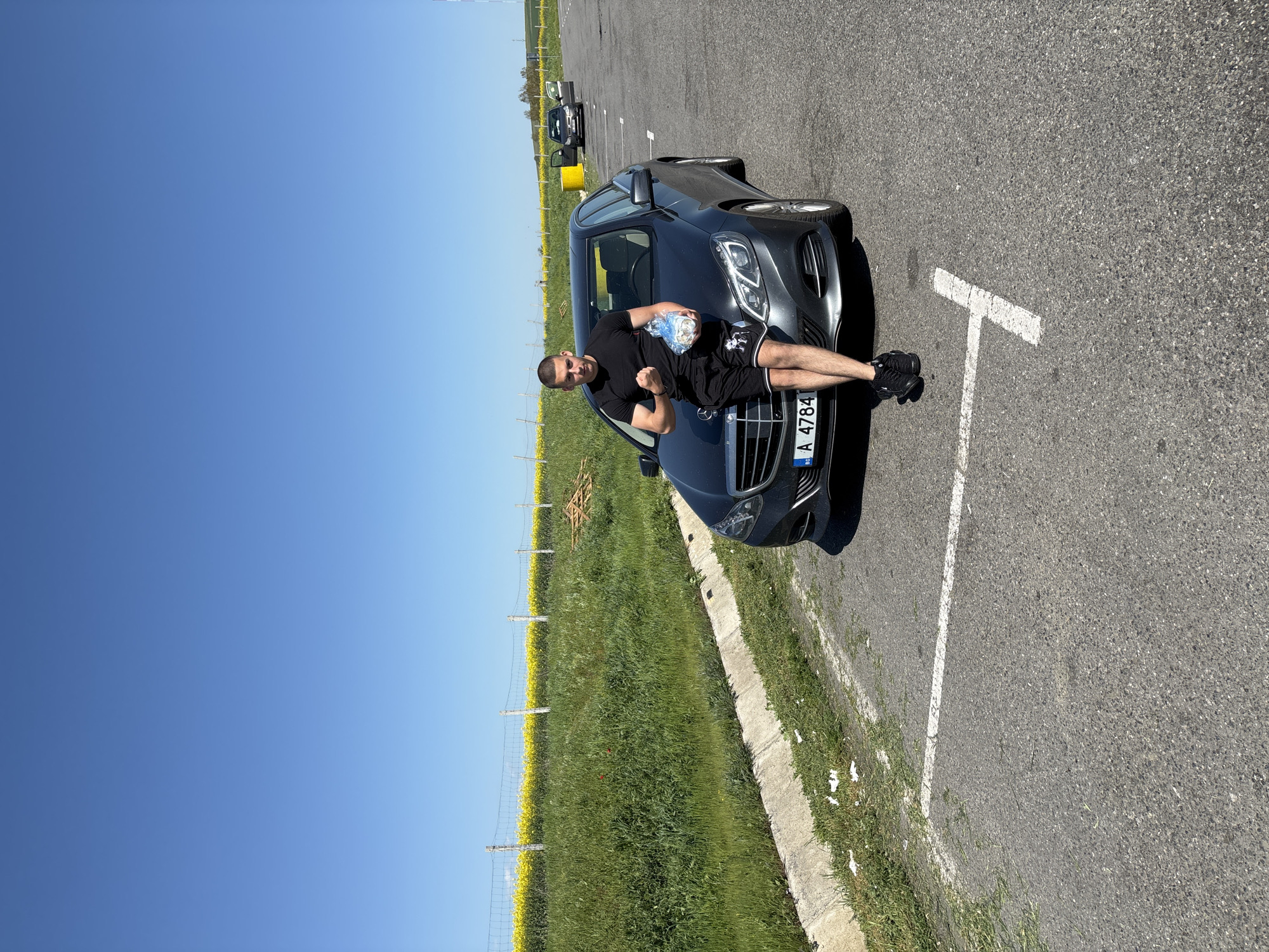 The image captures a man standing next to a dark gray Mercedes-Benz car in what appears to be a parking lot, possibly located in Zheleznik, Bulgaria