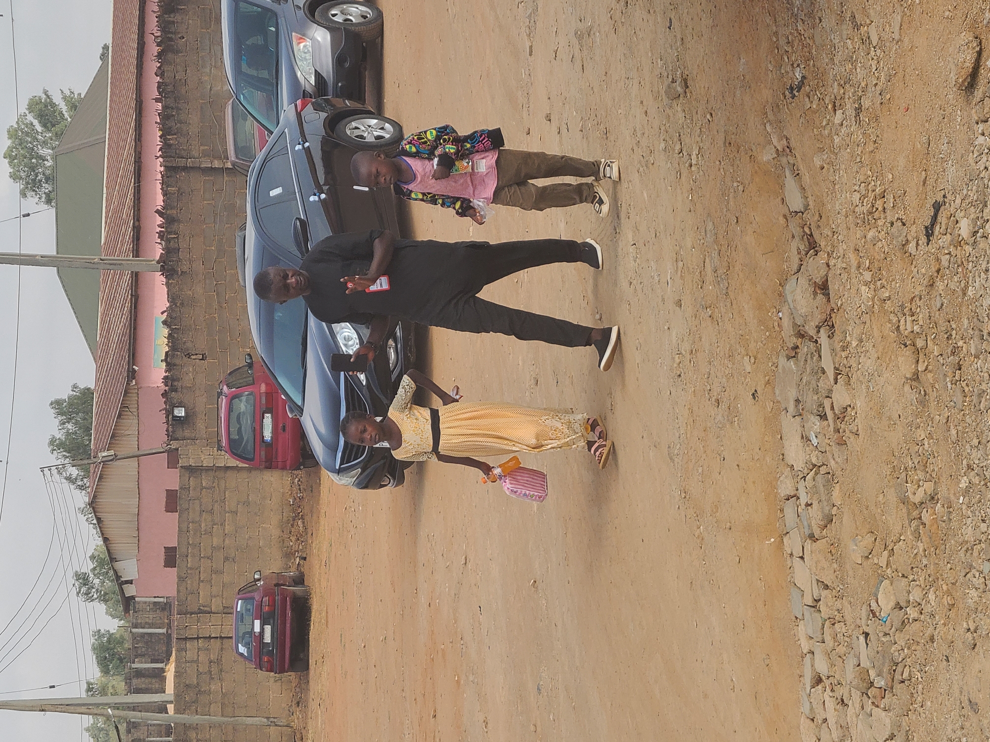 Three people stand on a dirt and gravel road. A man in a black outfit and black shoes stands in the middle, smiling, and holding a phone in his right hand. To his left, a young girl in a yellow dress with a black band around the waist and pink sandals carries a pink bag in her right hand. To the man's right, a young boy wearing a colorful jacket, a pink shirt, brown pants, and sneakers stands. Several cars are parked along the left side of the road. Buildings and power lines line the left side of the road, and a pile of rocks lines the right side of the road. The image was taken in Gura Top, Nigeria.