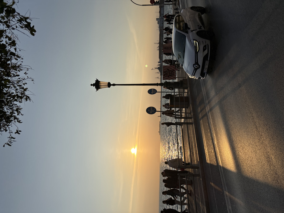 The image depicts a sunset scene along the waterfront promenade in the city of Thessaloniki Municipal Unit, Greece. The sun, a bright yellow-orange disc, is low on the horizon over a large body of water, casting a shimmering path of light across the rippled surface. The sky transitions from light blue overhead to warm orange and yellow hues near the horizon. In the foreground, a two-lane asphalt road is visible, marked by elongated, dark shadows cast by objects and people due to the low sun angle. A white, four-door Renault Clio hatchback, bearing the Greek license plate EHA-1895, travels from right to left on the road, partially obscuring its front end on the right side. Along the mid-ground, a black, ornate streetlamp stands upright, its lantern illuminated with a warm glow. To its left, a dark metal railing separates the road from a pedestrian promenade running parallel to the water. Multiple silhouetted pedestrians, approximately twenty in number, are visible walking and standing on this promenade, their forms backlit by the setting sun. Near the streetlamp, two circular blue traffic signs with white arrows (one pointing left, one pointing right) are mounted on posts, next to a brown public waste bin. In the distant background, across the water, the silhouette of a port or industrial area is visible, characterized by multiple tall cranes and various structures. A large vessel or ship is also visible on the horizon to the left. Overhanging dark green foliage from a tree is present in the upper right corner of the frame, partially obscuring the sky. A red traffic light is visible on a pole at the far right edge of the image.