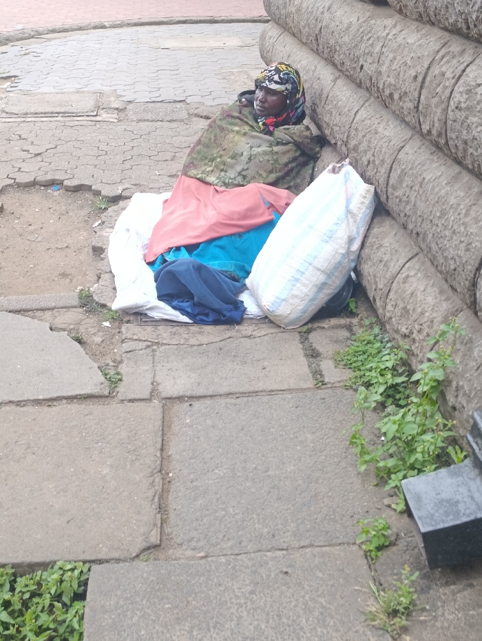 A woman sits on the stone pavement, leaning against a stacked stone structure. She is wrapped in blankets and wears a patterned headscarf. A large, striped sack rests next to her. The pavement is cracked and uneven, with small plants growing in the crevices and alongside the stone structure. The scene suggests poverty and hardship.