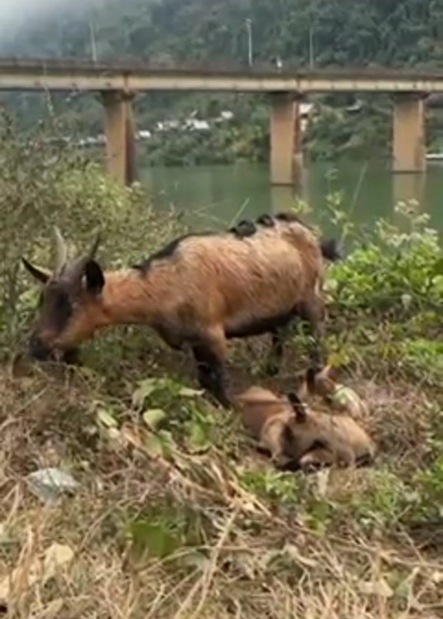 brown goat grazing by some greenery, with two young goats lying down nearby. In the background, there is a body of water and a bridge supported by pillars. The weather appears foggy or misty, obscuring the mountain landscape in the distance. The ground is covered with dried grass and shrubbery. There is also some trash visible on the ground. The camera angle is at ground level, looking slightly upwards towards the goat.