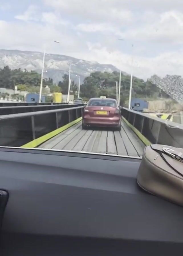 car driving onto a floating bridge. The car is red and has a yellow taxi sign on top. The bridge is made of planks and has yellow barriers on the sides. The camera is inside a car, looking out through the windshield and side window. There is a purse on the dashboard. Through the windows, water and land can be seen. The floating bridge is a simple structure for vehicles to cross the water. The scene shows the car crossing from one side to the other. There is a knocking or banging sound.
