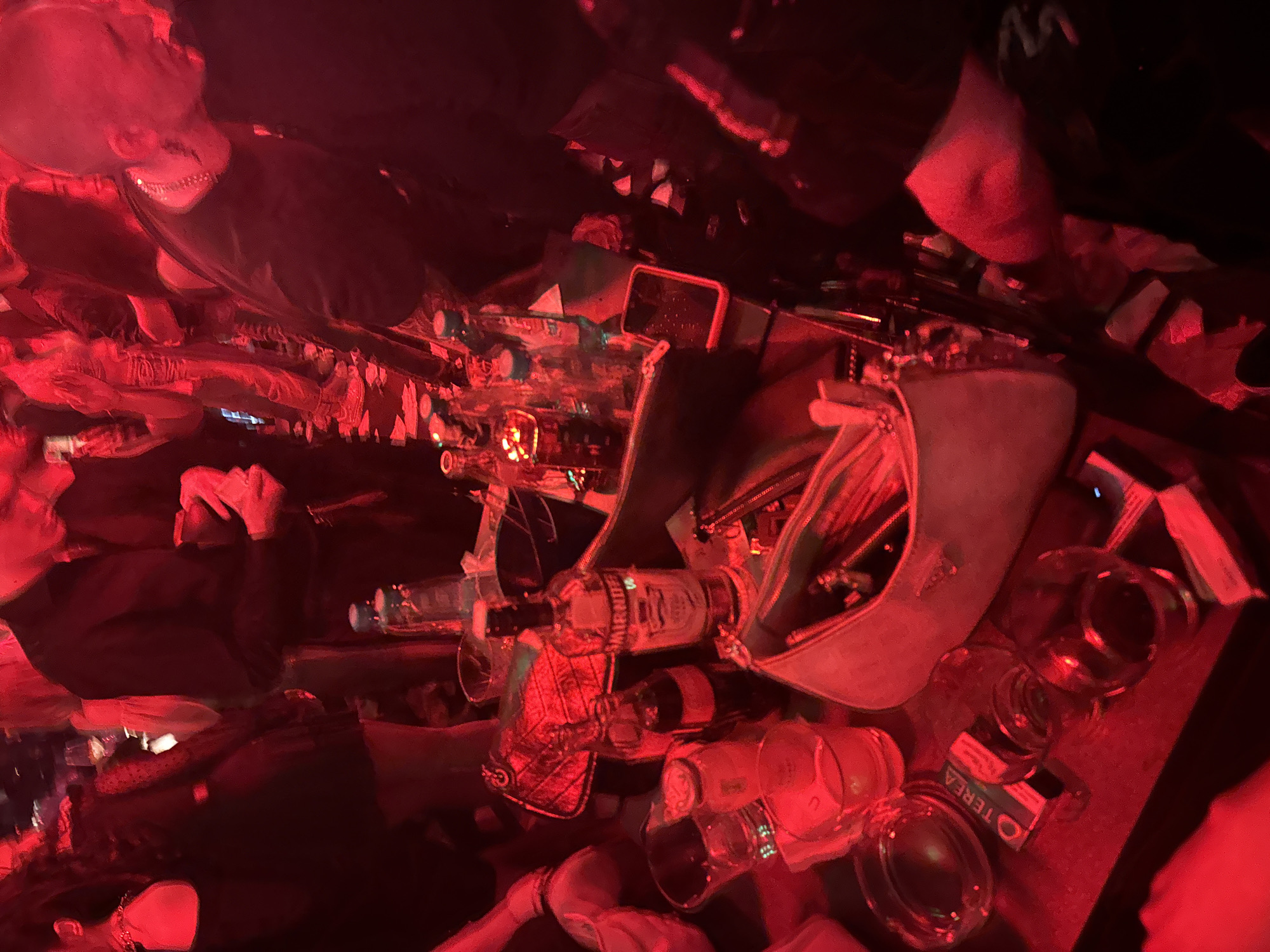 The image depicts a crowded indoor establishment, likely a nightclub or bar, characterized by pervasive red ambient lighting