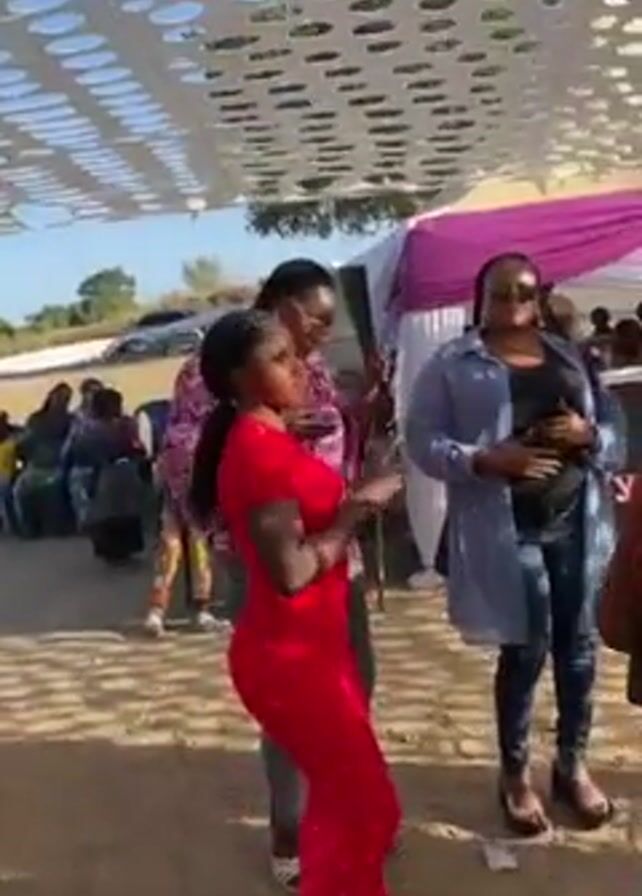 Several women dance beneath a white tent in an outdoor setting. One woman wears a bright red outfit with white polka dots and bounces to the music. A woman beside her wears a patterned pink and brown top with dark pants. Another woman stands with her wearing a light blue jacket and sunglasses. Other women stand and sit nearby. The scene appears to be at a party.