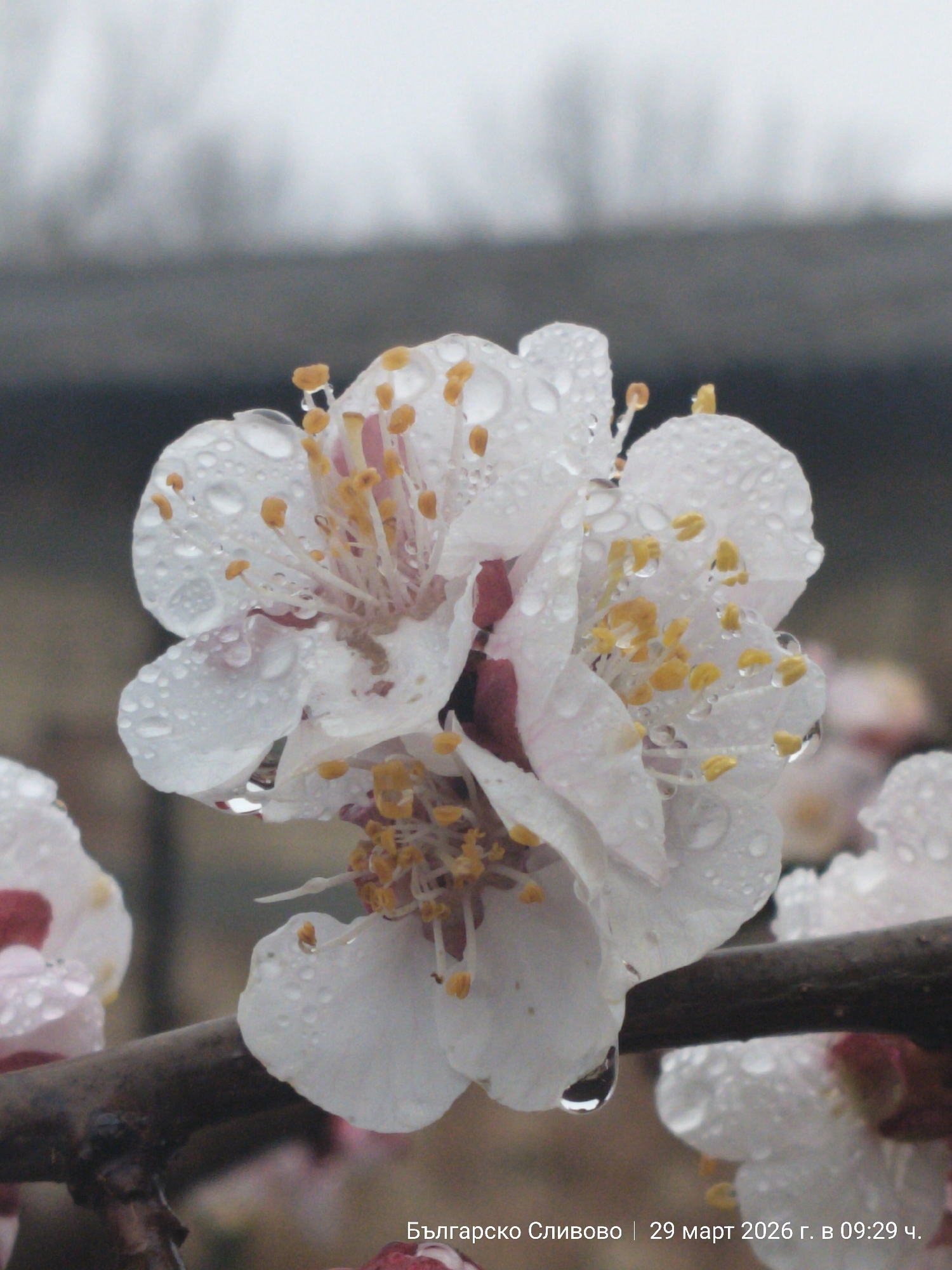 Close-up photograph of blossoming plum flowers covered in water droplets, likely after a rain. The flowers are white with pinkish-red centers and yellow stamens. The branch the flowers are on is brown and appears to be a plum tree. The background is out of focus and shows a gray, overcast sky, and some blurred shapes that appear to be buildings or trees. Text at the bottom of the image reads "Българско Сливово | 29 март 2026 г. в 09:29 ч." which translates to "Balgarsko Slivovo | March 29, 2026 at 09:29". The location is identified as Balgarsko Slivovo, Bulgaria. The image captures a close view of plum blossoms covered in water droplets on a branch, taken on March 29, 2026, at 09:29, in Balgarsko Slivovo, Bulgaria.
