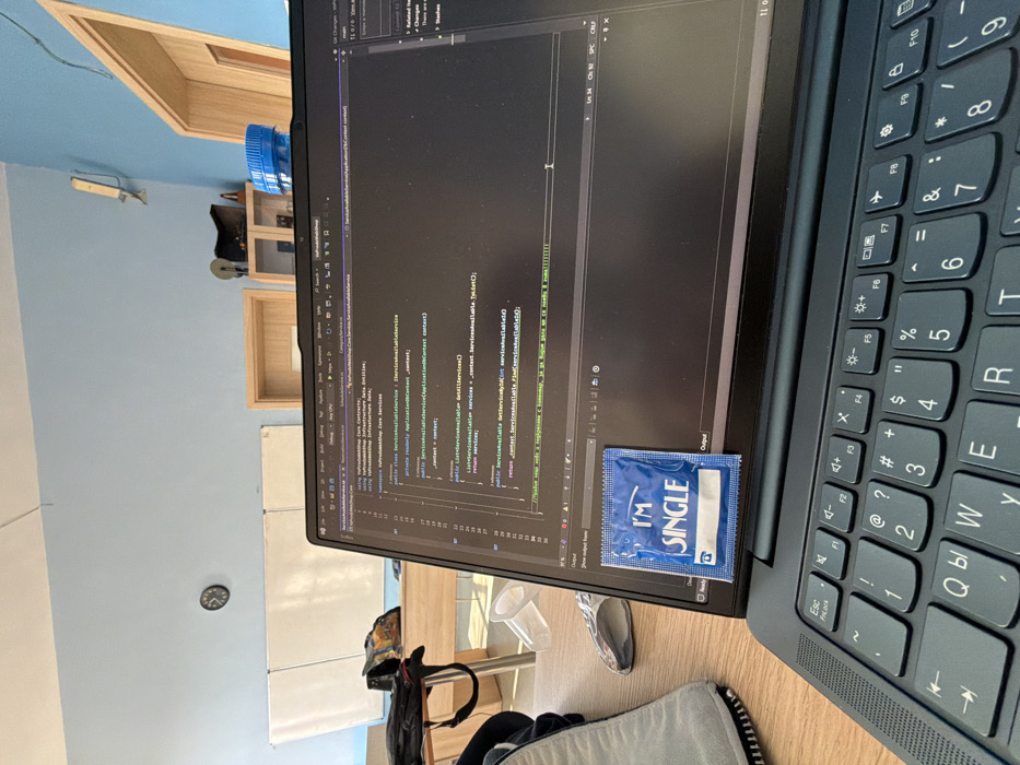 The scene depicts an interior setting in the city of Pernik, Bulgaria. A dark grey Lenovo laptop rests on a wooden desk surface, open and powered on. The laptop screen displays an Integrated Development Environment (IDE) with C# code, specifically showing a `ServiceAvailableService` class within the `Vufruwebshop.Core.Services` namespace. A blue condom packet, printed with the text "I'M SINGLE" and a telephone icon, is adhered to or resting on the lower-left bezel of the laptop screen, partially obscuring the output area. To the left of the laptop, on the wooden desk, an overturned clear plastic cup, a dark computer mouse, and a light grey fabric object are visible. The background features light blue walls. On the left wall, a round black clock is mounted above a partially visible white whiteboard. Towards the right, a light-colored wooden door frame is visible, along with a shelf containing several dark objects. A blue plastic bottle with a white cap is positioned on a shelf in the upper right background. A dark bag or backpack is draped over an object in the far left background. The room is brightly illuminated.