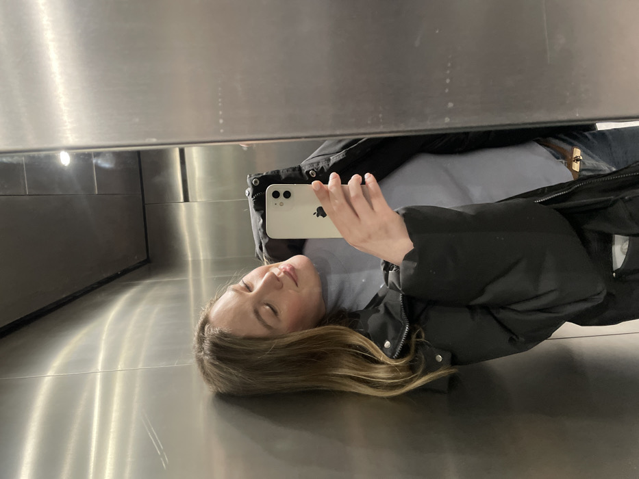 A young woman, lying on a reflective surface, possibly metal or glass, takes a selfie with a white iPhone. She is wearing a light gray shirt under a black puffer jacket. Her eyes are closed, and she appears relaxed. The reflection captures part of the surrounding environment, including what may be an elevator interior. The lighting is bright and somewhat diffuse, creating a soft glow on the surfaces.