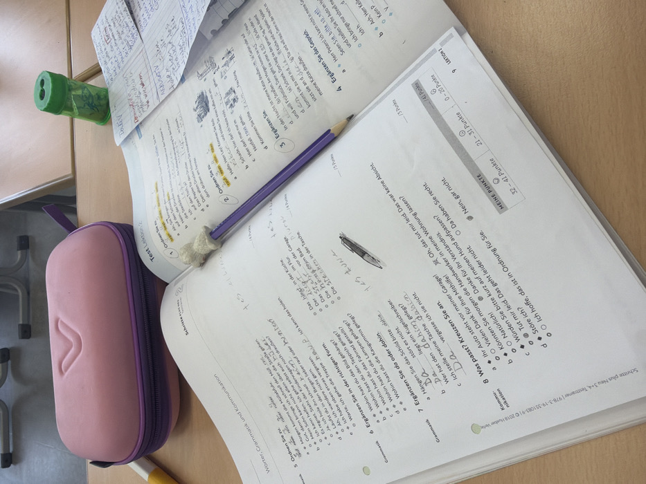- "The image displays a close-up, elevated view of a light-colored wooden desk in what appears to be a classroom or study environment in Dresden, Germany" by FM-87sX52, licensed under CC BY 4.0